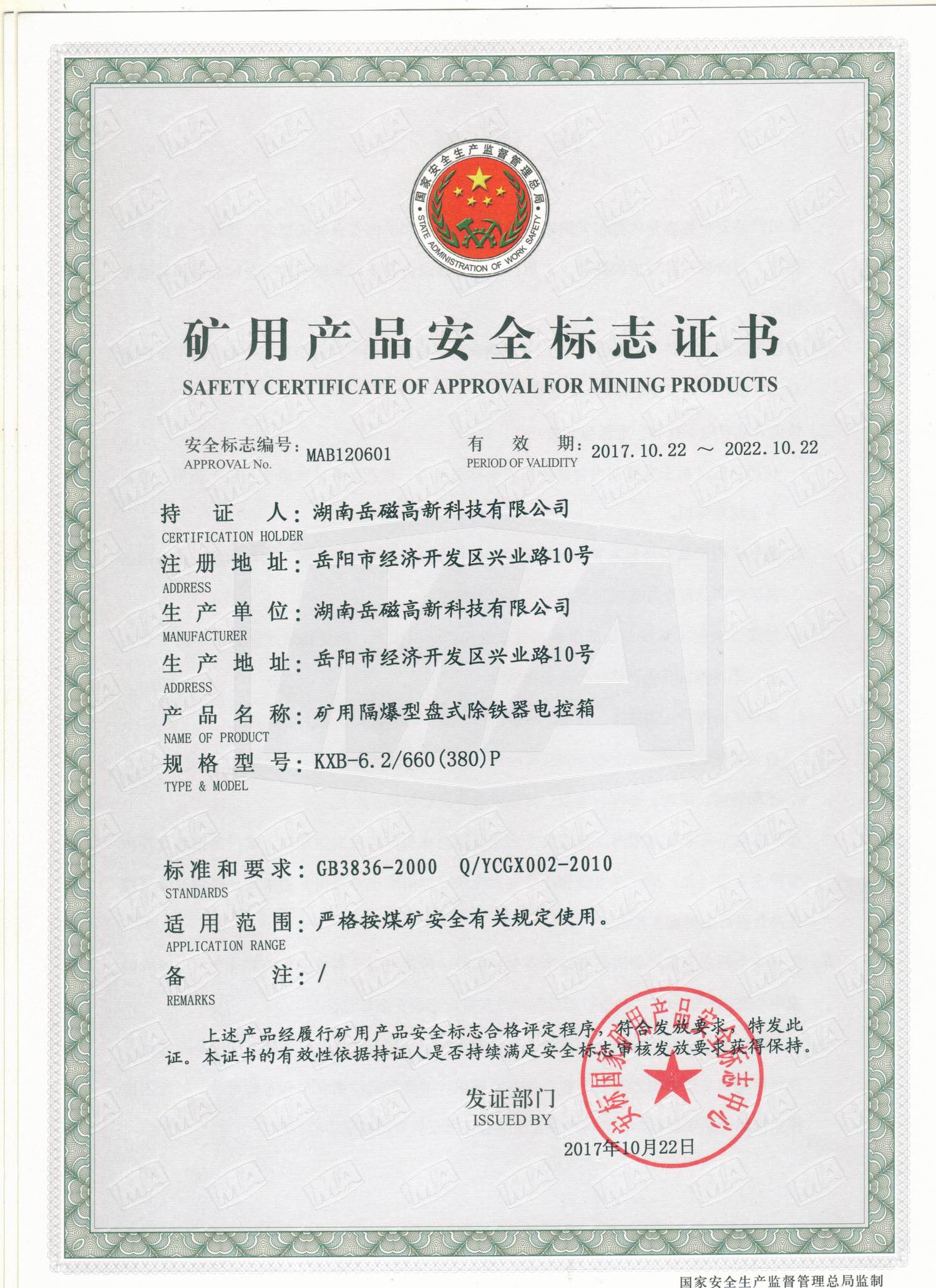 礦用產(chǎn)品安全標(biāo)志證書