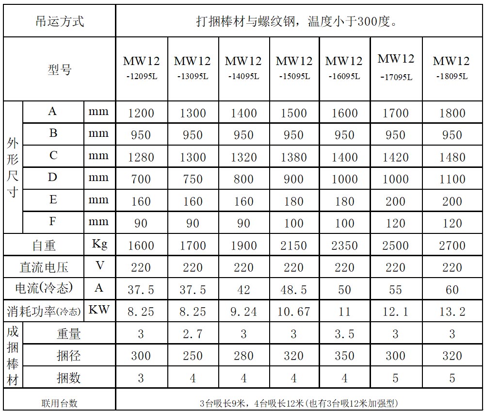 棒材與螺紋鋼有足夠的吸力。按打捆棒材的捆數與排寬,并留有一定余量(200-300mm),選取電磁鐵長度。