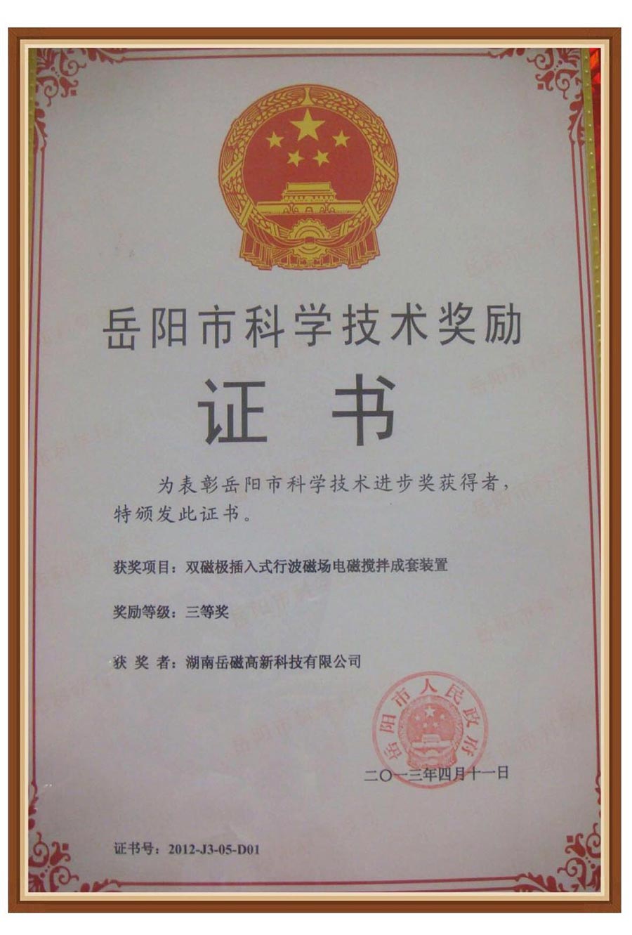 公司以具有完全知識產(chǎn)權“雙磁極插入式行波磁場電磁攪拌成套裝置”項目申報,經(jīng)過申報資料評審,向評審專家答疑,評審組到公司現(xiàn)場考察等環(huán)節(jié),榮獲2013年度岳陽市科技技術獎勵三等獎,并在全市科技創(chuàng)新暨科學技術獎勵大會上公布并頒發(fā)榮譽證書。